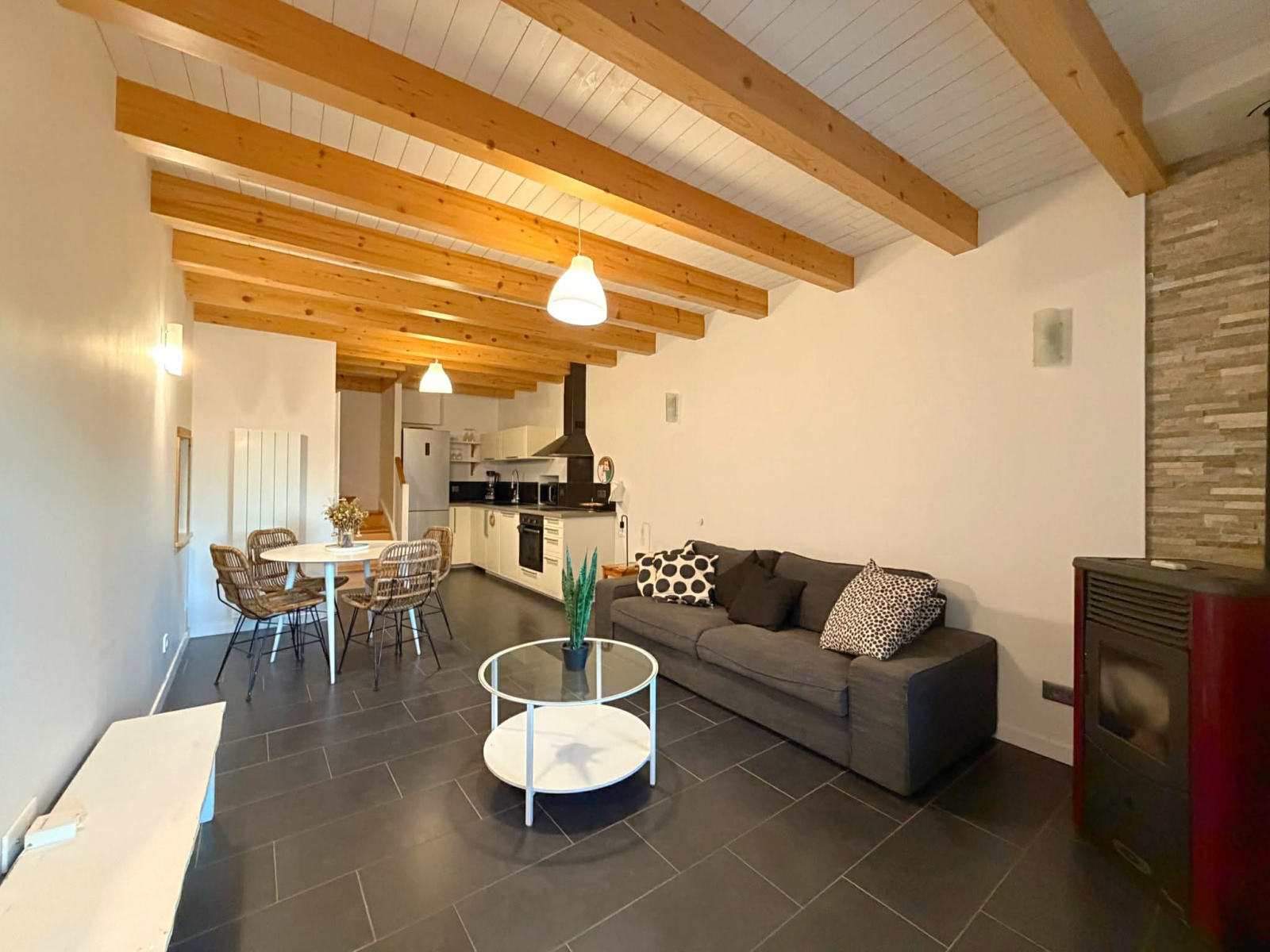 Au niveau principal; entrée par la terrasse sur une belle pièce de vie avec cuisine ouverte aménagée et équipée chauffée par un poêle à granules et une buanderie / cellier.